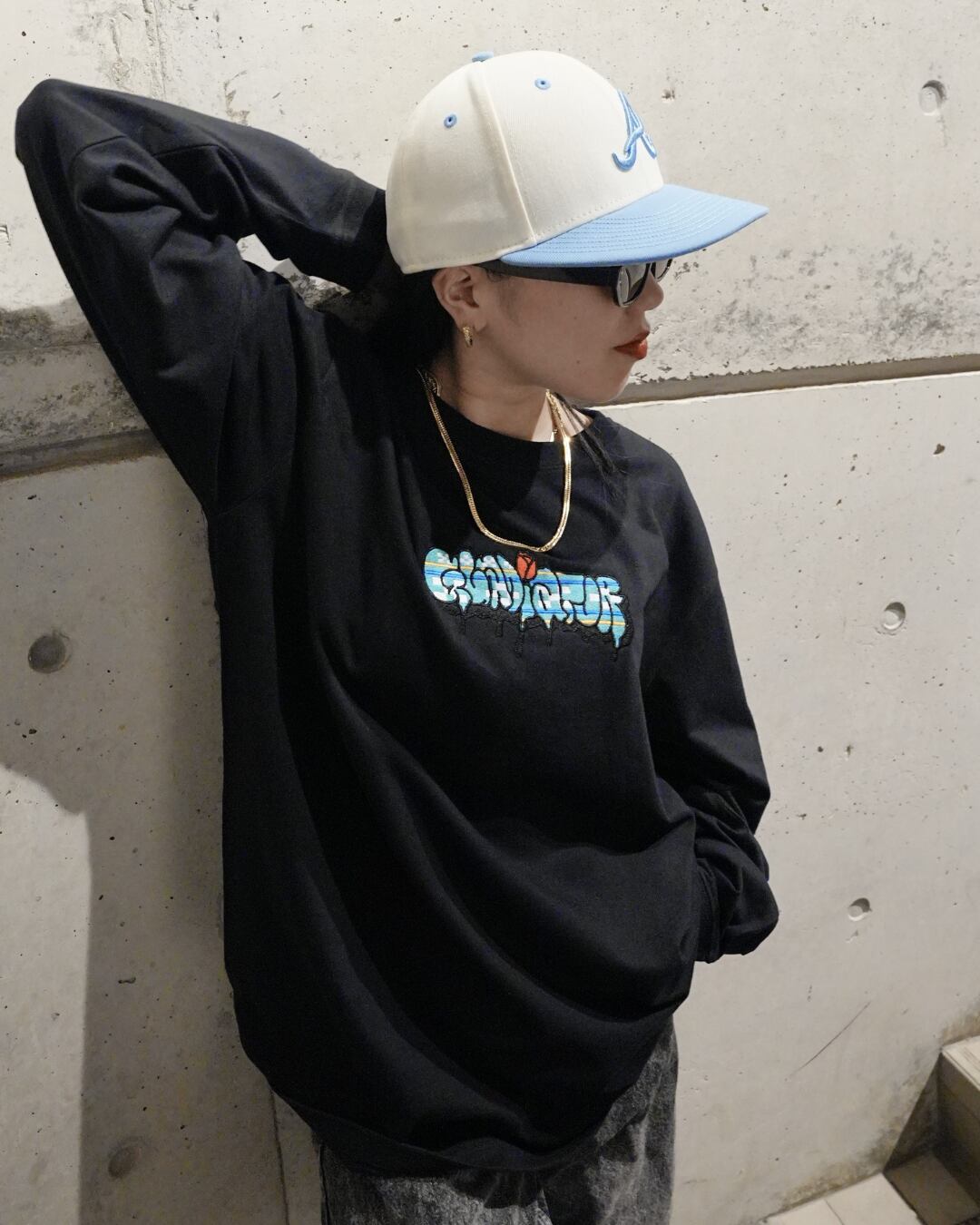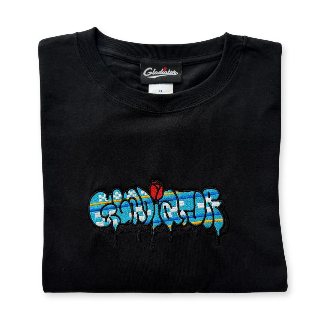 Gladiator文字をGraffitiで描かれたロゴの中に、沖縄伝統の「ミンサー」を刺繍で表現した商品。