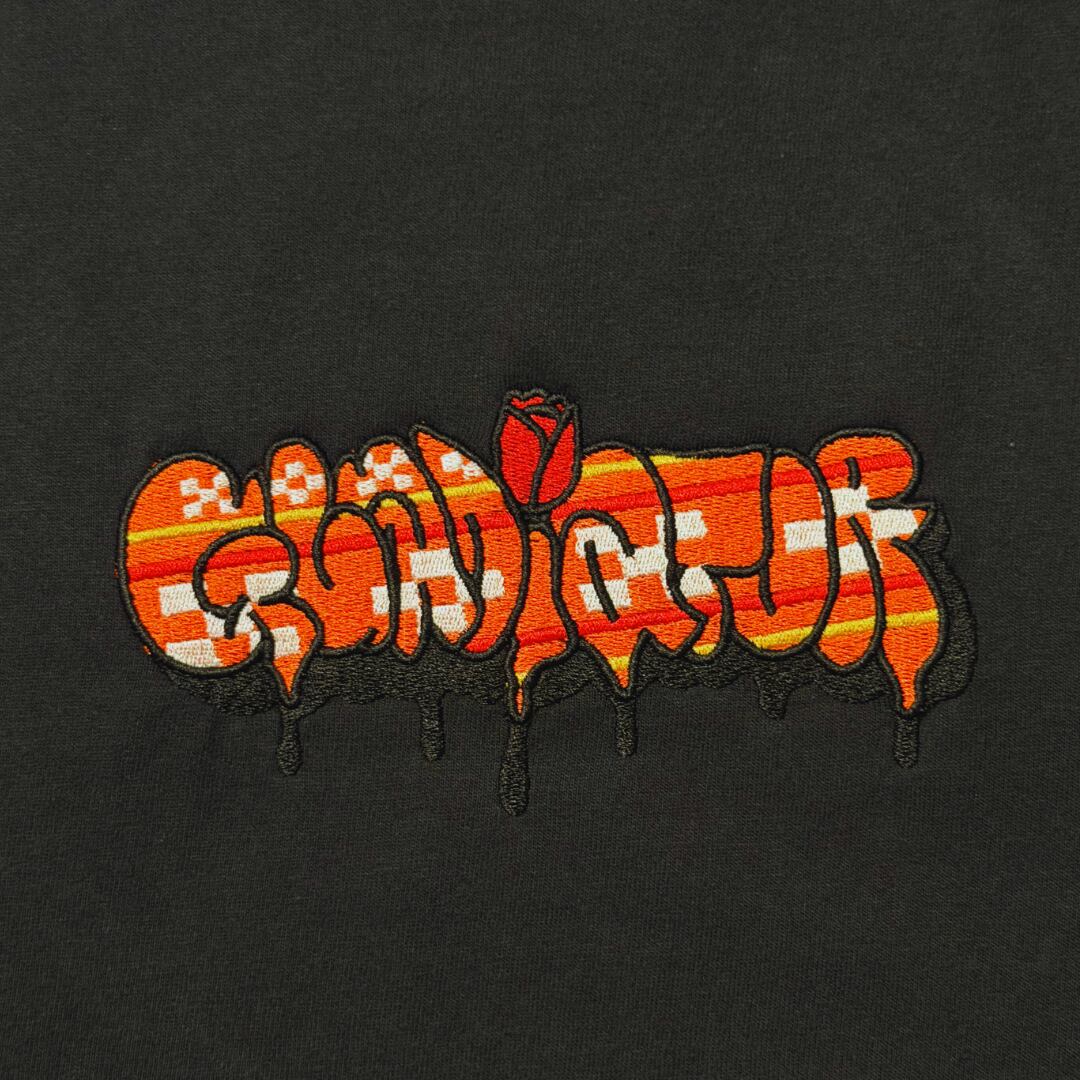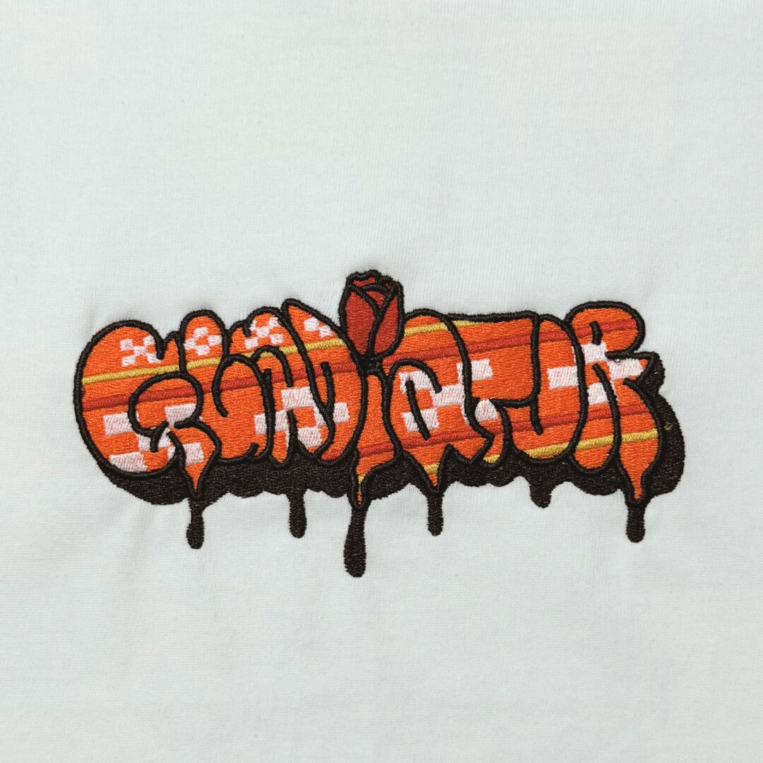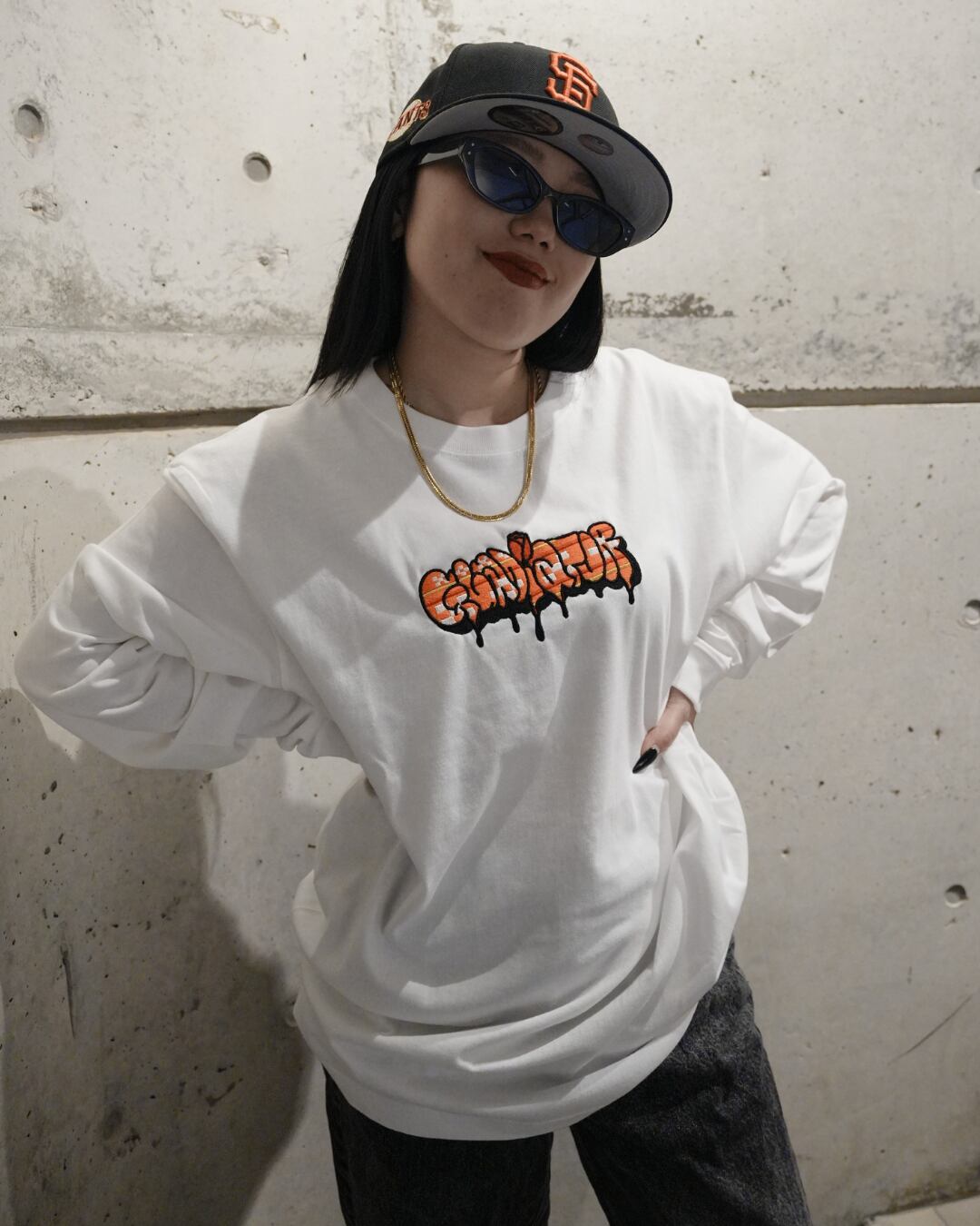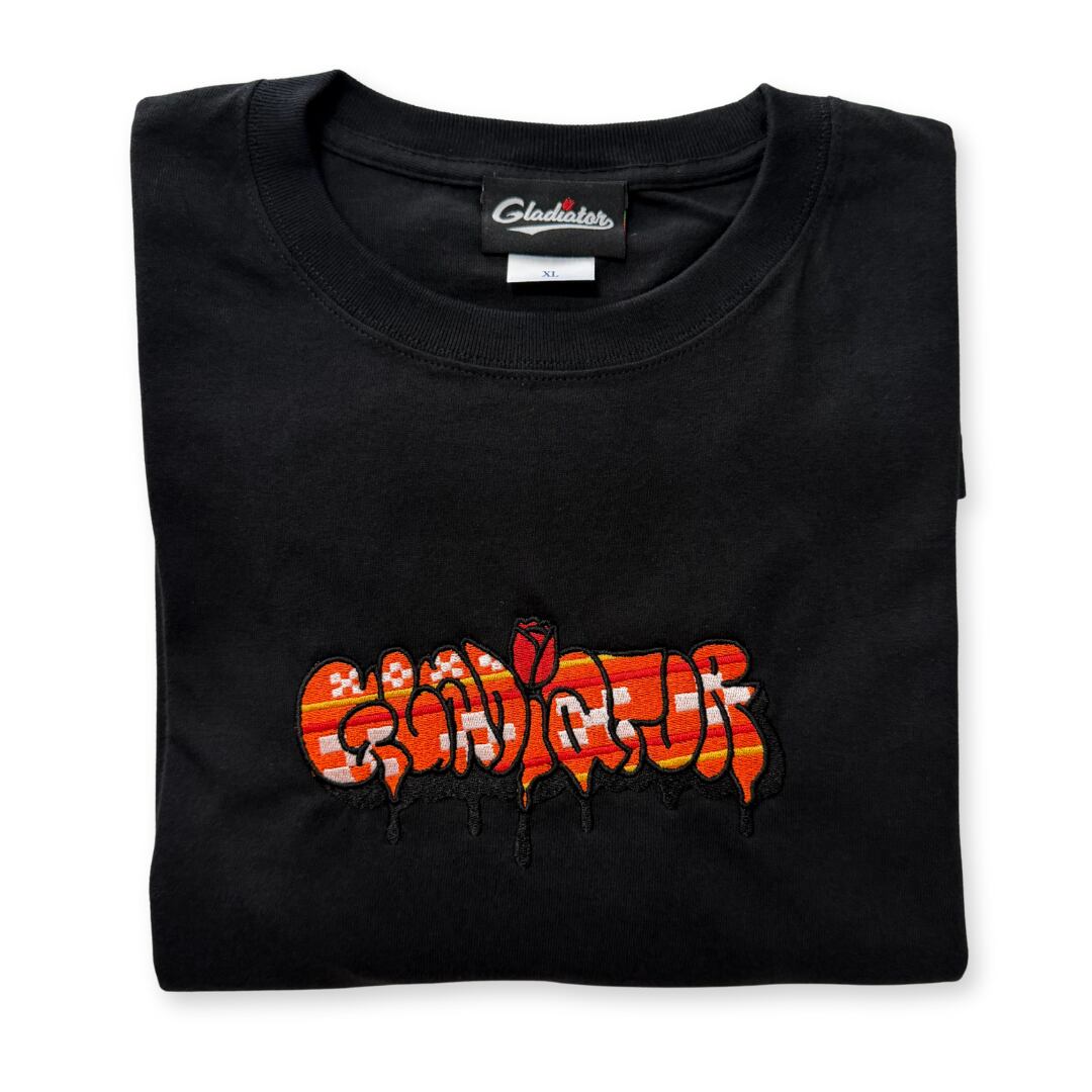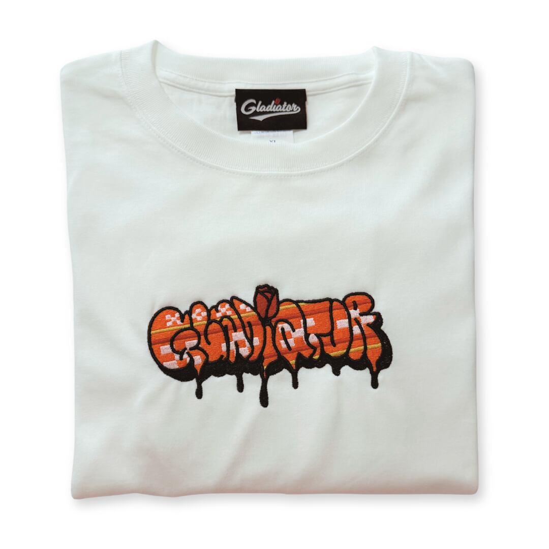 Gladiator文字をGraffitiで描かれたロゴの中に、沖縄伝統の「ミンサー」を刺繍で表現した商品。