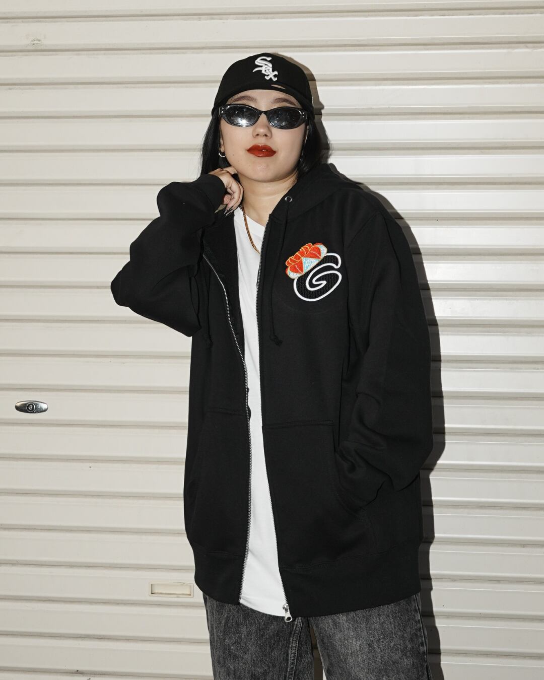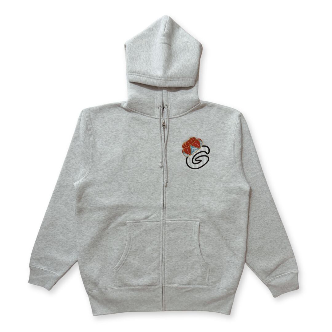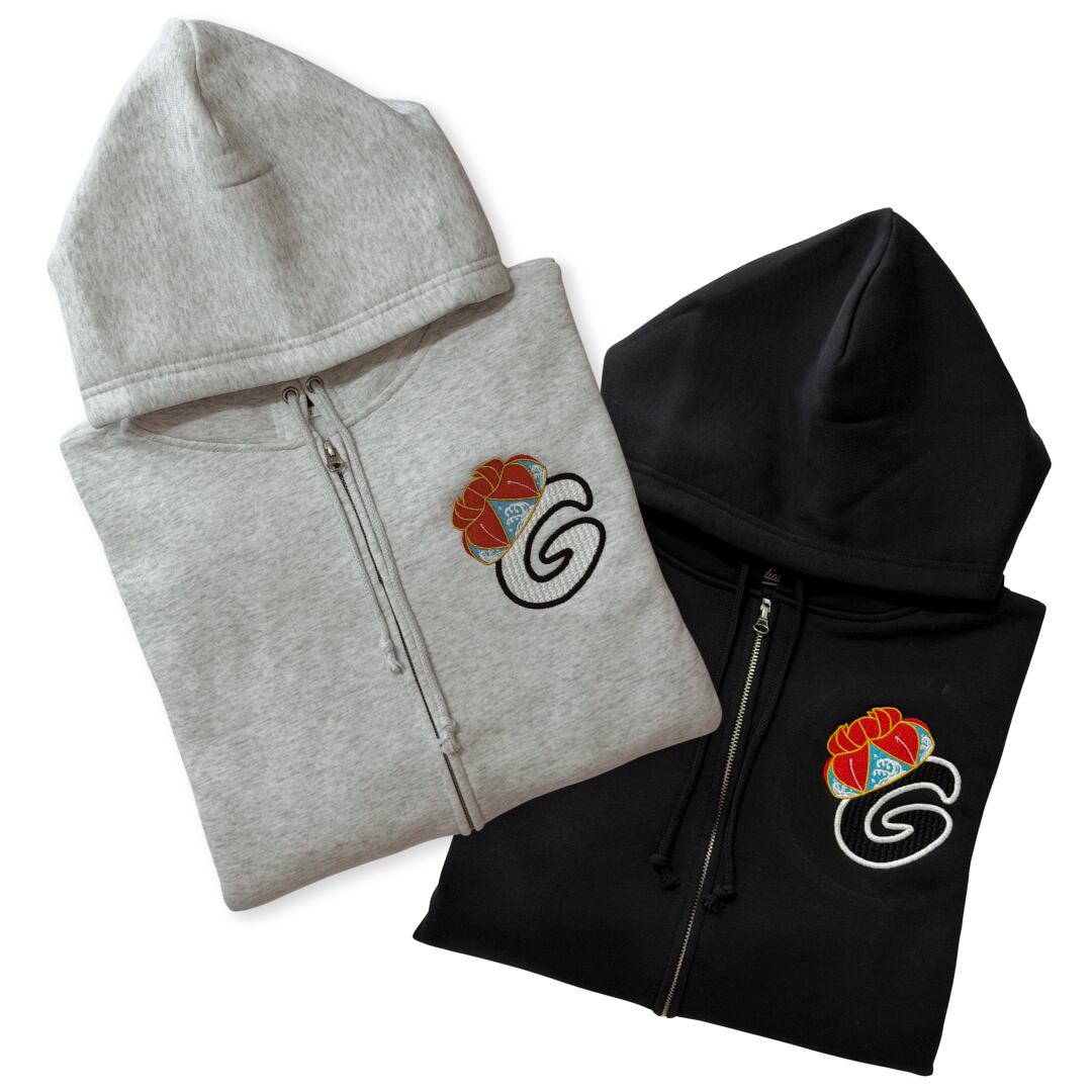 Gladiator の「G」と「花笠」を融合させたロゴを、刺繍で表現したデザイン。