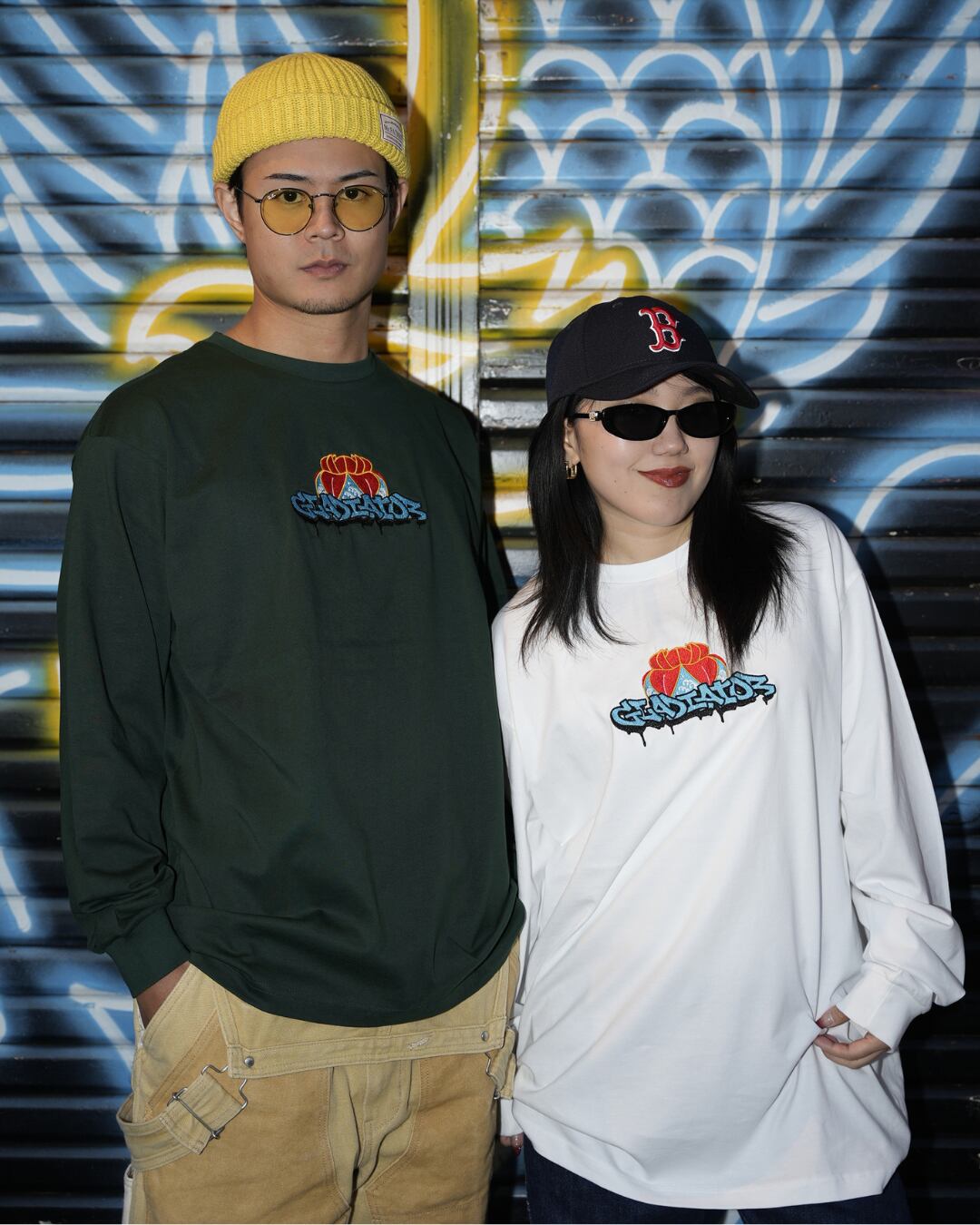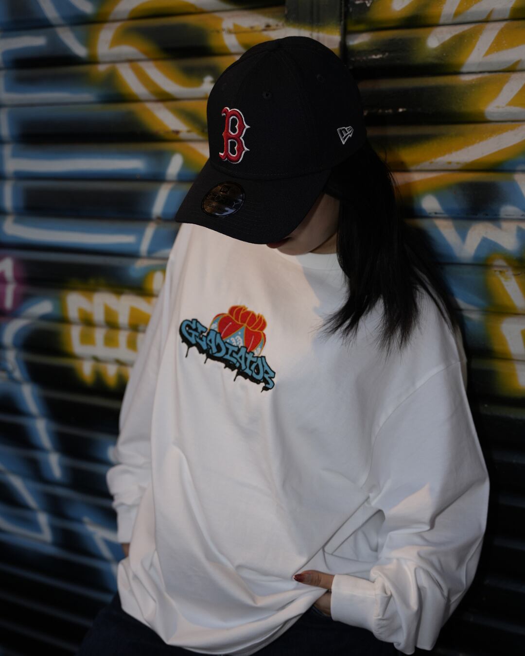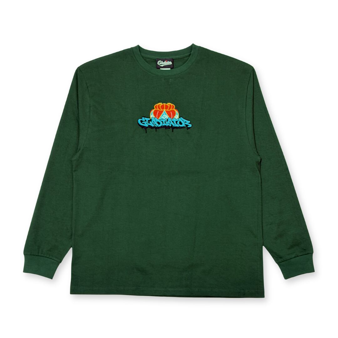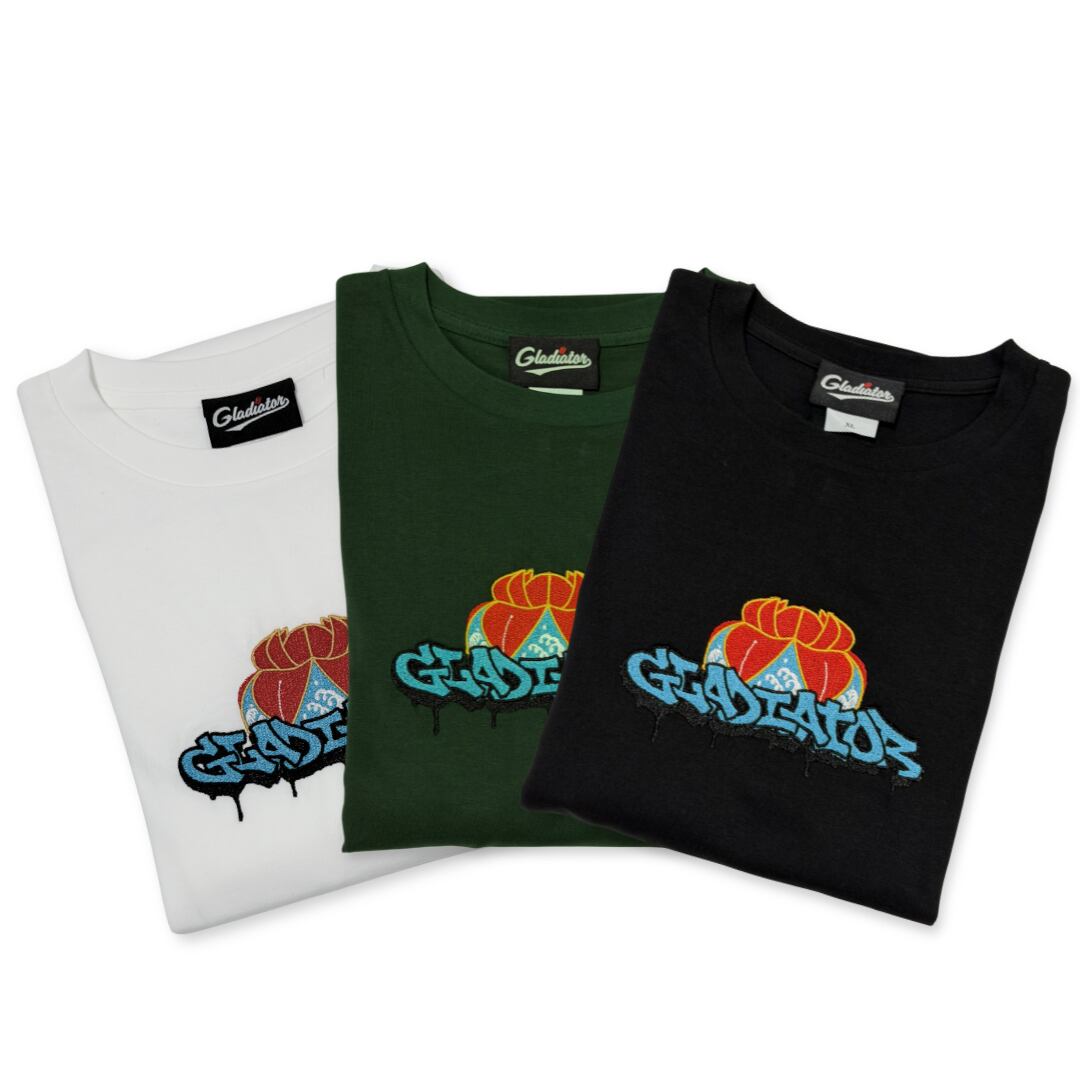沖縄の花笠とGraffitiで描かれたGladiatorの文字を融合したデザインを刺繍で表現しました。